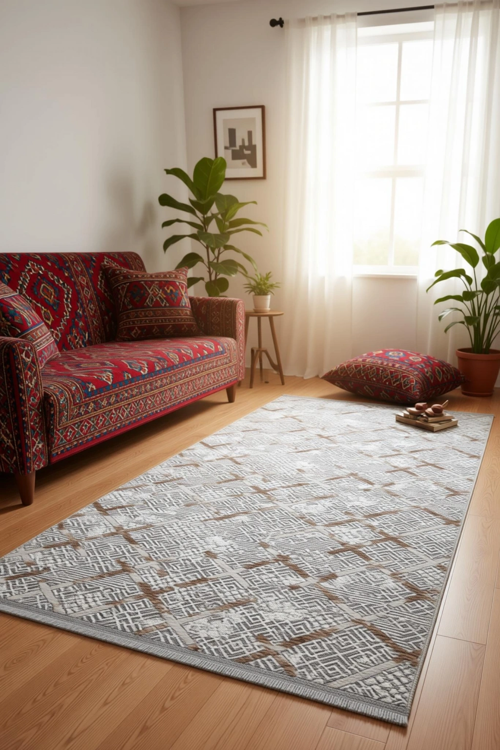 • Çok Yönlü Kullanım: Modern geometrik desenleri sayesinde salon, oturma odası, yatak odası, mutfak ve koridor gibi evin her alanına estetik bir uyum sağlar.